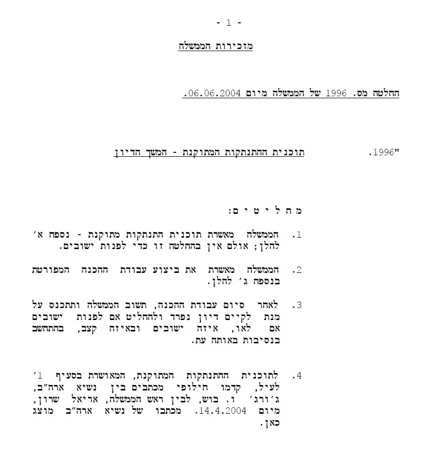 ההחלטה התקבלה ב-6 ביוני. שבעה שרים התנגדו. שרון: "מדינת ישראל עשתה היום צעד בעל חשיבות מכרעת לעתידה". איתם: "זו אחת ההחלטות השחורות של מדינת ישראל, שמשמעותה הקמת מדינת טרור חמאס על מגש של דם יהודי". ynet מגיש: נוסח ההחלטה המלא.