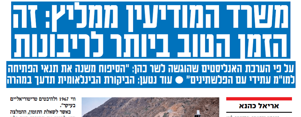ב-19 ליוני 2020 פורסם במהדורה המודפסת של ישראל היום שמשרד המודיעין טוען שזה הזמן הטוב ביותר להכלת ריבונות. לדעתי חשיבותה של הידיעה נובעת מכך שדעה זו עומדת בניגוד לעמדת גורמים אחרים במערכת הביטחון. מדובר בעוד ניסיון להעביר את הנושא בציבור ולשם כך נעשה שימוש בעוד צינור שנמצא בשליטתו של נתניהו.[1]