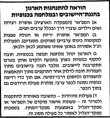 - המפא"ר אוסרת יריות או הטלת פצצות על מקומות כינוס ערביים (שווקים, מסגדים). הפעולות הנ"ל אסורות באופן שאינו משתמע לכאן ולכאן.